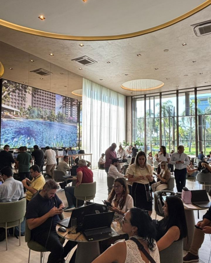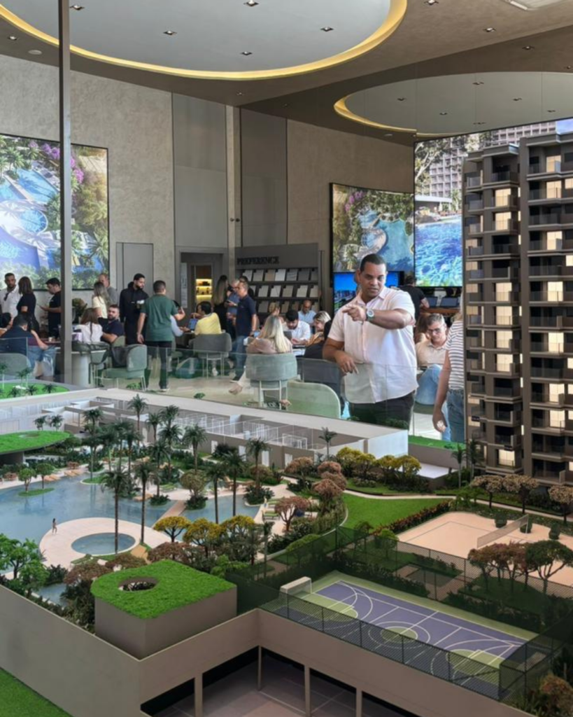 O estande está cheio desde as primeiras horas, com grande presença de corretores e clientes interessados em conhecer de perto o projeto. O movimento intenso confirma a expectativa positiva em torno do lançamento e reforça o interesse do mercado por mais um produto nessa região.